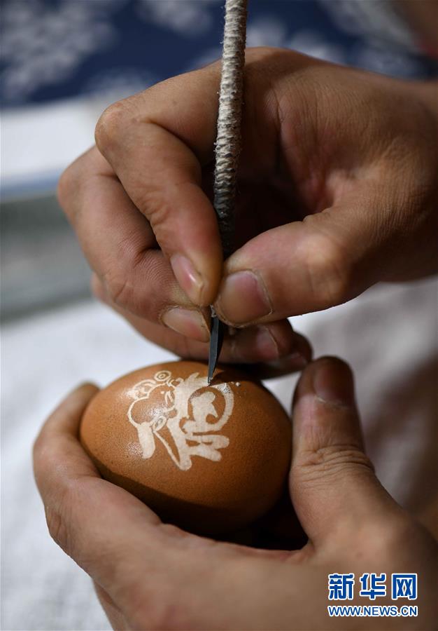 4月17日,在石家庄市桥西区非遗传承基地,民间艺人张晓贺在挑选鸡蛋。新华社发(陈其保 摄)
