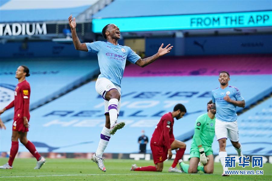 7月2日,曼城队球员斯特林(右二)在比赛中射门。 当日,在2019-2020赛季英格兰足球超级联赛第32轮比赛中,曼城队主场以4比0战胜利物浦队。 新华社/路透