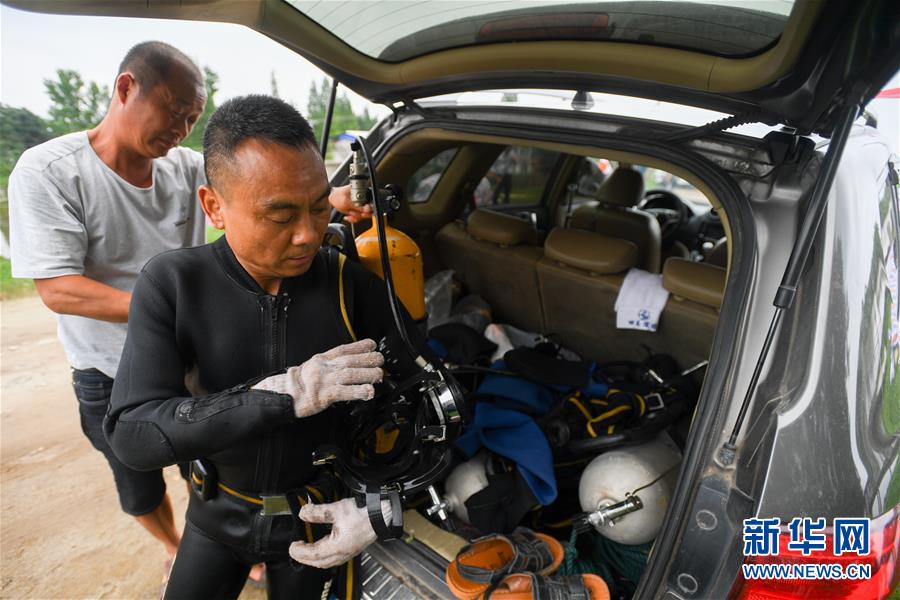 徐庆九准备进入湖南省岳阳市华容县藕池河一处有险情的涵闸进行潜水排险作业(7月13日摄)。新华社记者 陈泽国 摄