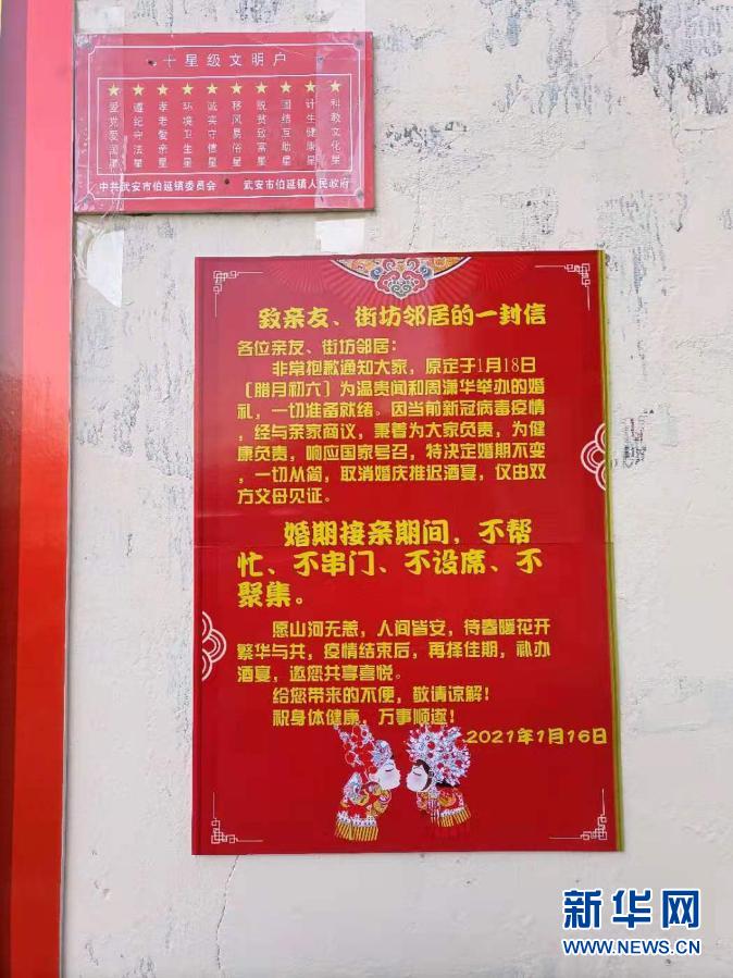 河北省武安市伯延镇罗峪村新人温贵闻家门口张贴的取消婚庆、推迟酒宴的一封信 (1月18日摄)。新华社发
