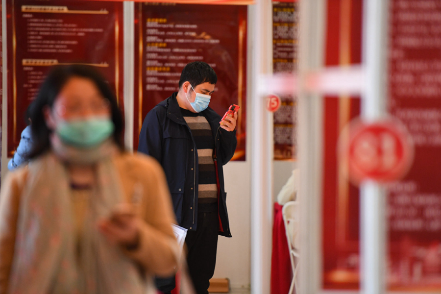 2月18日,在长沙天心文化产业园,一位求职者在手机上查找岗位信息。记者陈泽国 摄