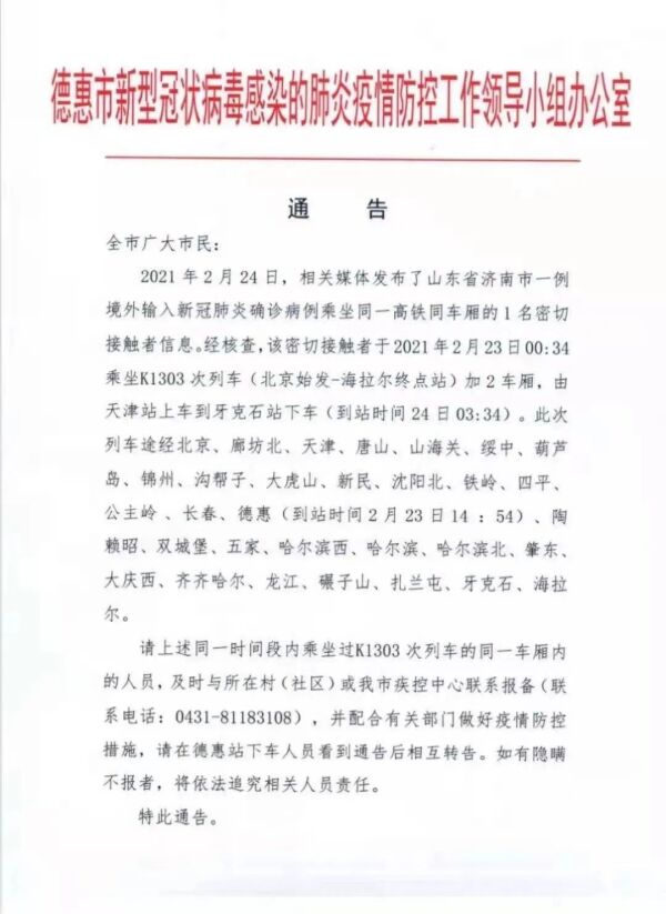 2021年2月24日,相关媒体发布了山东省济南市一例境外输入新冠肺炎确诊病例乘坐同一高铁同车厢的1名密切接触者信息。经核查,该密切接触者于2021年2月23日00:34乘坐K1303次列车(北京始发-海拉尔终点站)加2车厢,由天津站上车到牙克石站下车(到站时间24日03:34)。此次列车途经北京、廊坊北、天津、唐山、山海关、绥中、葫芦岛、锦州、沟帮子、大虎山、新民、沈阳北、铁岭、四平、公主岭(2月23日13:01到站)、长春、德惠、陶赖昭、双城堡、五家、哈尔滨西、哈尔滨、哈尔滨北、肇东、大庆西、齐齐哈尔、龙江、碾子山、扎兰屯、牙克石、海拉尔。