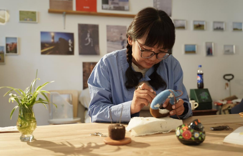 如今,莲花的作品销量稳步上涨着,甚至邮寄到了国外。一般早上7点,她就会提前到咖啡馆擀毡子、打扫卫生,等店员过来后继续创作。“她身上带着牧区的处事方式”,马欣说,即便店员只是临时工,她也会管吃管住,教各种手艺,甚至推心置腹开导对方,“店里不像打工的地方,更像一个家。”