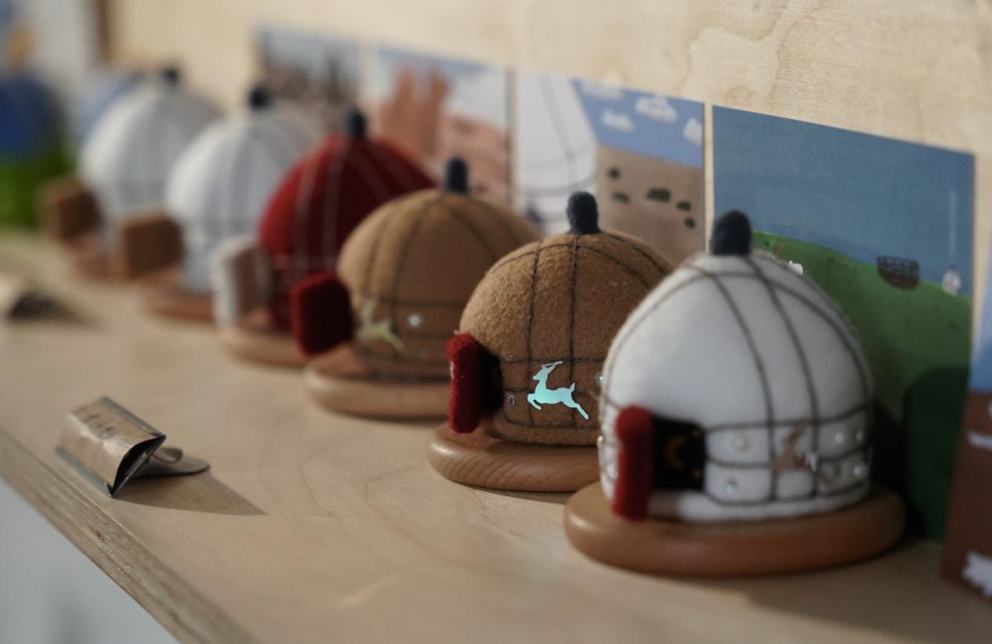 那时莲花可以一个月不社交,她像待在一个洞里忘了时间,“等反应过来,作品已经做好了,还会疑惑这是我做出来的吗。”这些作品后来基本成了工作室的畅销款,如“草原四季”挂件,不同季节的天空与草原戳在“甜甜圈”上,圆环中心卧着小羊羔和蒙古包;“巴尔虎小怪兽”则是将蒙古包做成小精灵,它肚子里装满星空,正大张着嘴,想啃食掉人的烦恼。