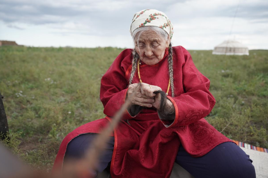 ▲88岁的奶奶坐在草场上细细捻搓驼毛,手编成绳。胡弘彪|摄