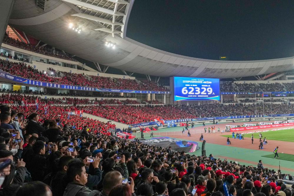 11月1日,“苏超”决赛现场大屏幕显示共有62329名观众观赛。新华社记者 李博 摄