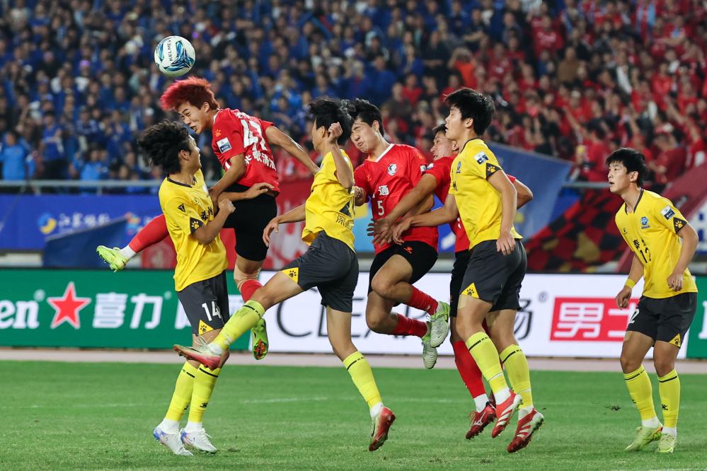 11月1日,南通队球员金成民(左二)在比赛中争顶。在江苏南京举行的2025江苏省城市足球联赛(“苏超”)决赛中,南通队与泰州队在常规时间0比0战平,通过点球大战,泰州队总比分4比3战胜南通队,夺得冠军。新华社记者 李博 摄