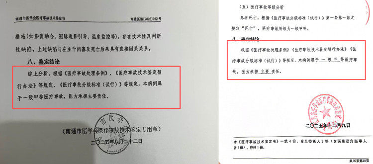 一个成功率很高的微创手术,为何会导致宋女士死亡?上游新闻记者梳理受南通市卫健委委托,南通市医学会、江苏省医学会分别在2025年8月22日和2025年12月9日出具的《医疗事故技术鉴定书》中发现,专家认定南通市第一人民医院在手术流程和操作中均存在明显错误。