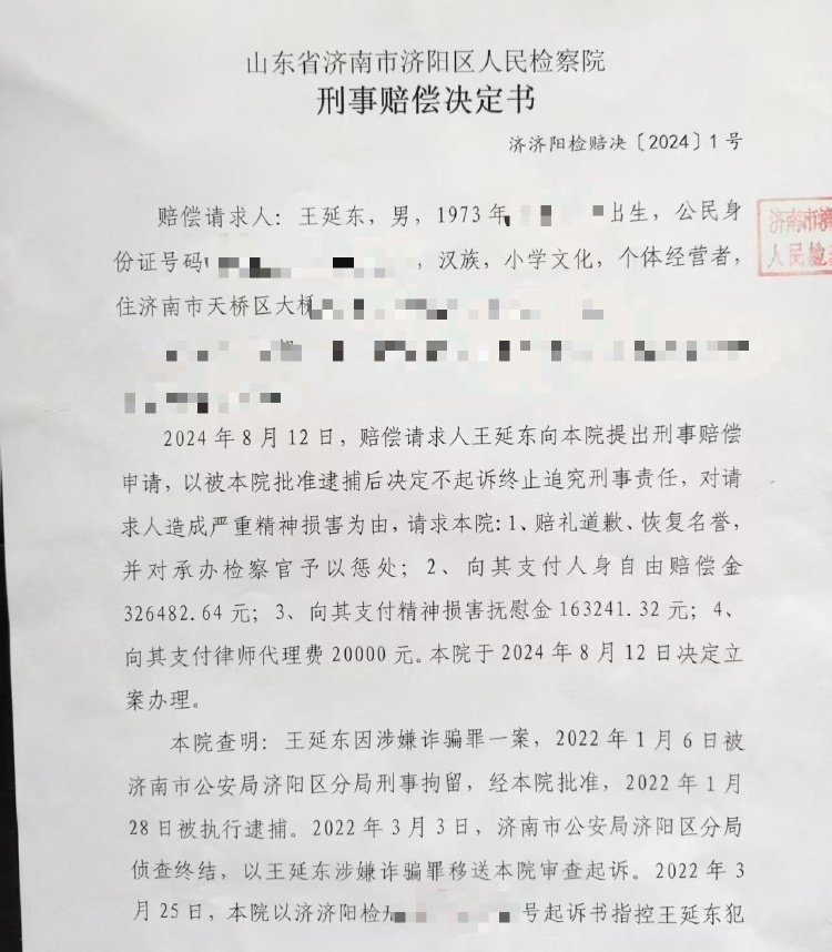 2024年10月11日,济南市济阳区人民检察院出具《刑事赔偿决定书》,其内容显示:王延东获得人身自由赔偿金326945.08元、精神损害抚慰金163000元,合计489945.08元,并在王延东夫妻二人住所地发布相关信息,为其恢复名誉并赔礼道歉;其他赔偿请求,不予支持。另据王延东介绍,他妻子的文书一致,检察院支持的赔付金额夫妻二人共计应获979890.16元。