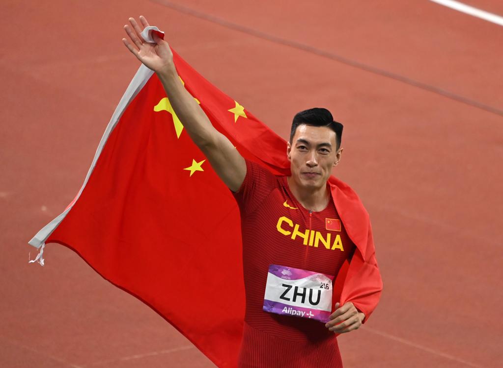 在男子三级跳远赛场,东京奥运会亚军、中国选手朱亚明在第三跳中跳出17米13的成绩收获冠军。另一名中国选手方耀庆以16米93的成绩获得银牌,铜牌被印度选手摘得。