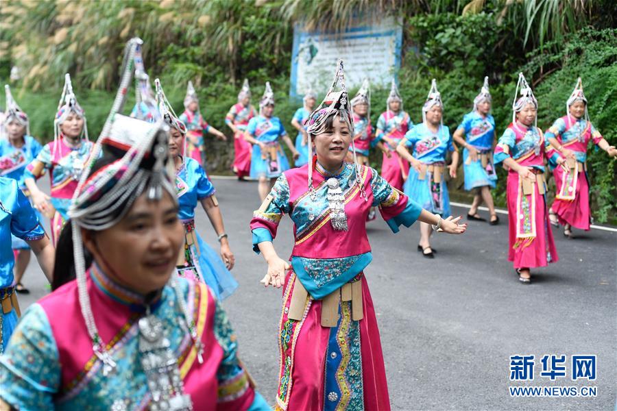 7月18日,身穿传统服装的畲族村民在迎候宾客。 新华社记者 黄宗治 摄