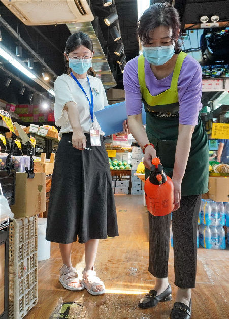 6月19日,北京市丰台区东高地街道工作人员(左)检查辖区内商户环境消毒防疫工作。新华社记者 李欣 摄