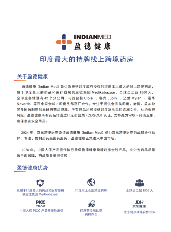 盈德健康作为京东健康跨境医药数十家战略合作企业中唯一的印度本土战略合作伙伴,凭借成熟的跨境供应链体系,持续助力京东完善国际医疗产品供给布局。