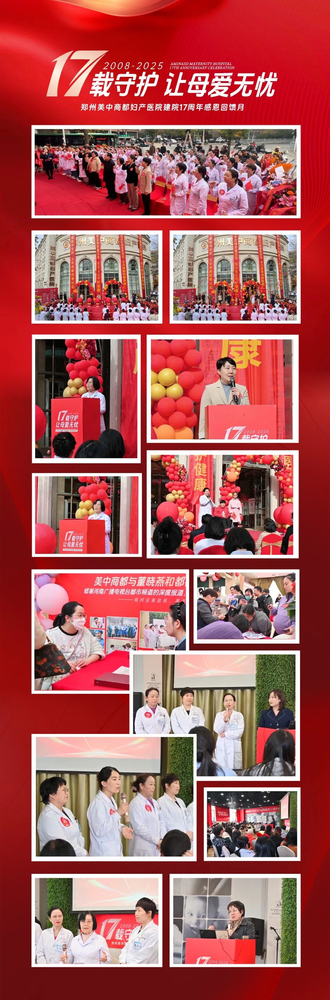 十七年,是一座值得铭记的里程碑,记录着荣耀与成长;十七年,更是一个充满希望的新起点,预示着责任与未来。郑州美中商都妇产医院将继续秉持“以患者为中心”的服务理念,坚守医者初心,不断提升医疗质量与服务内涵,为保障广大妇婴健康、助力健康中原建设贡献新的、更大的力量!