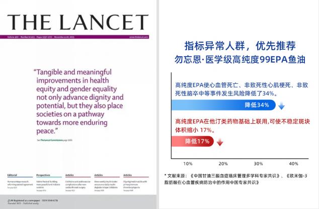对于DHA占比宜低不宜高、养护心脑应选择高纯度EPA鱼油的说法,并不是空穴来风。全球最具影响力的权威医学期刊——《柳叶刀》子刊2024年研究指出:单方EPA可使心血管事件风险降低34%;而同剂量EPA+DHA的混合配方仅能降低12%,差异非常显著。