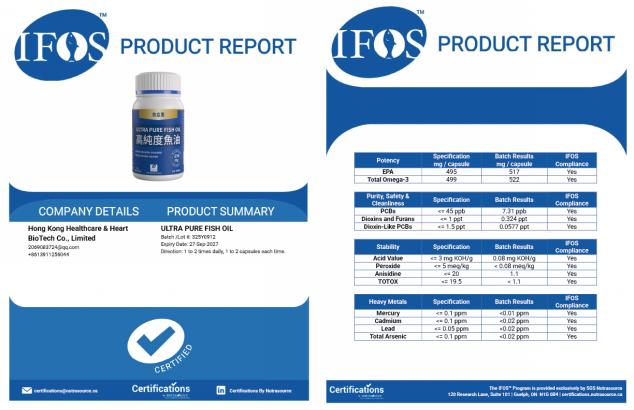 3. 查认证:蓝帽只是低门槛,国际IFOS五星认证的鱼油标准和品质才更高,勿忘恩高纯鱼油的检测报告来自IFOS唯一认可的质量法的权威检测;