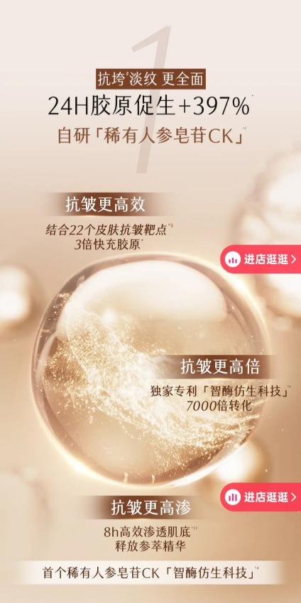 直播间内,主播手持“抗皱美白双管齐下”的纸牌宣传“黑金针胶原弹”时解释道:“脸垮、脸松、皱纹等都是胶原蛋白在支撑,稀有人参皂苷CK渗透到皮肤肌底到达真皮层进行改善,24h速充胶原。胶原蛋白补起来了,脸垮脸松问题自然解决。整个皮肤,皱纹纹路问题会改善,而且能美白能祛斑。”