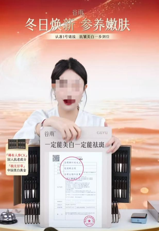 “一定能美白,一定能祛斑”,谷雨护肤旗舰店内的主播手持美白祛斑特证说道。在她的表述中,黄褐斑、色斑等,脸垮、凹陷等问题都可以由“1号链接黑金针胶原弹”解决。