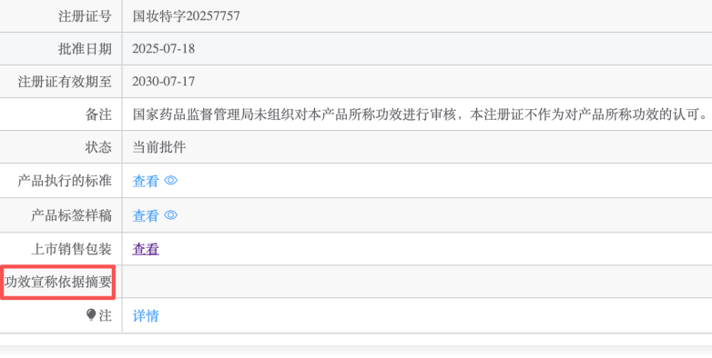 然而,根据上述两款产品的备案信息,其产品成分中均不含有作为祛斑剂用途使用的成分。并且,上述两款产品的详情页内均未对“祛斑”功效做进一步说明。