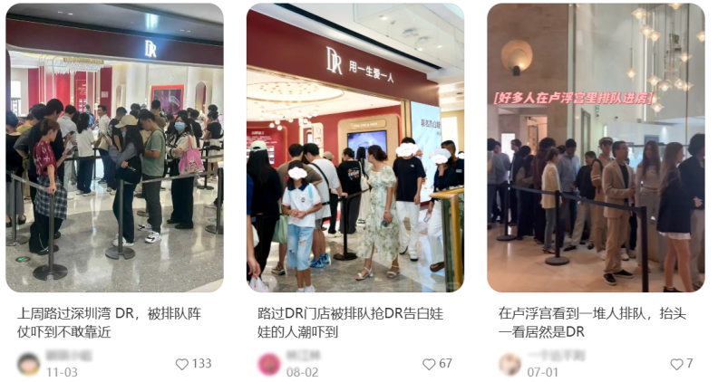 这一转变在珠宝市场尤为明显:一贯以“真爱体验”著称的珠宝品牌DR,其线下体验店人气逐渐上升,社交平台上不时能看到消费者分享在店外排队的场景,尤其在明星婚嫁佩戴DR出圈后,专程前往选购婚嫁五金的顾客也有所增加。DR似乎正成为越来越多消费者的珠宝首选目的地。