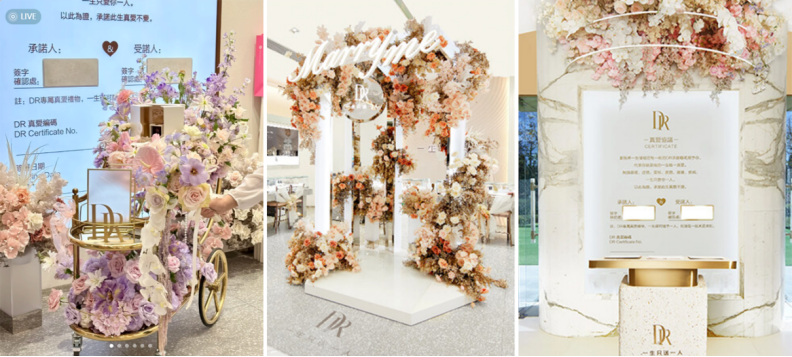 除了购买规则,线下门店设置的体验区也强化了这种仪式感。例如,顾客可以亲手推出载着信物的花车,而后在鲜花围绕的求婚厅中单膝跪地,完成对爱人的郑重告白,再来到写满誓言的真爱协议墙,共同许诺并签署下彼此姓名。与此同时,DR真爱屏上会亮起两人的珍贵影像,让这场爱的仪式,在过往的甜蜜和当下的感动中圆满落幕。对部分人来说,选择DR不只为一枚珠宝,更是为一次具有纪念意义的体验,在品牌构建的场景中,完成对彼此关系的确认与表达。