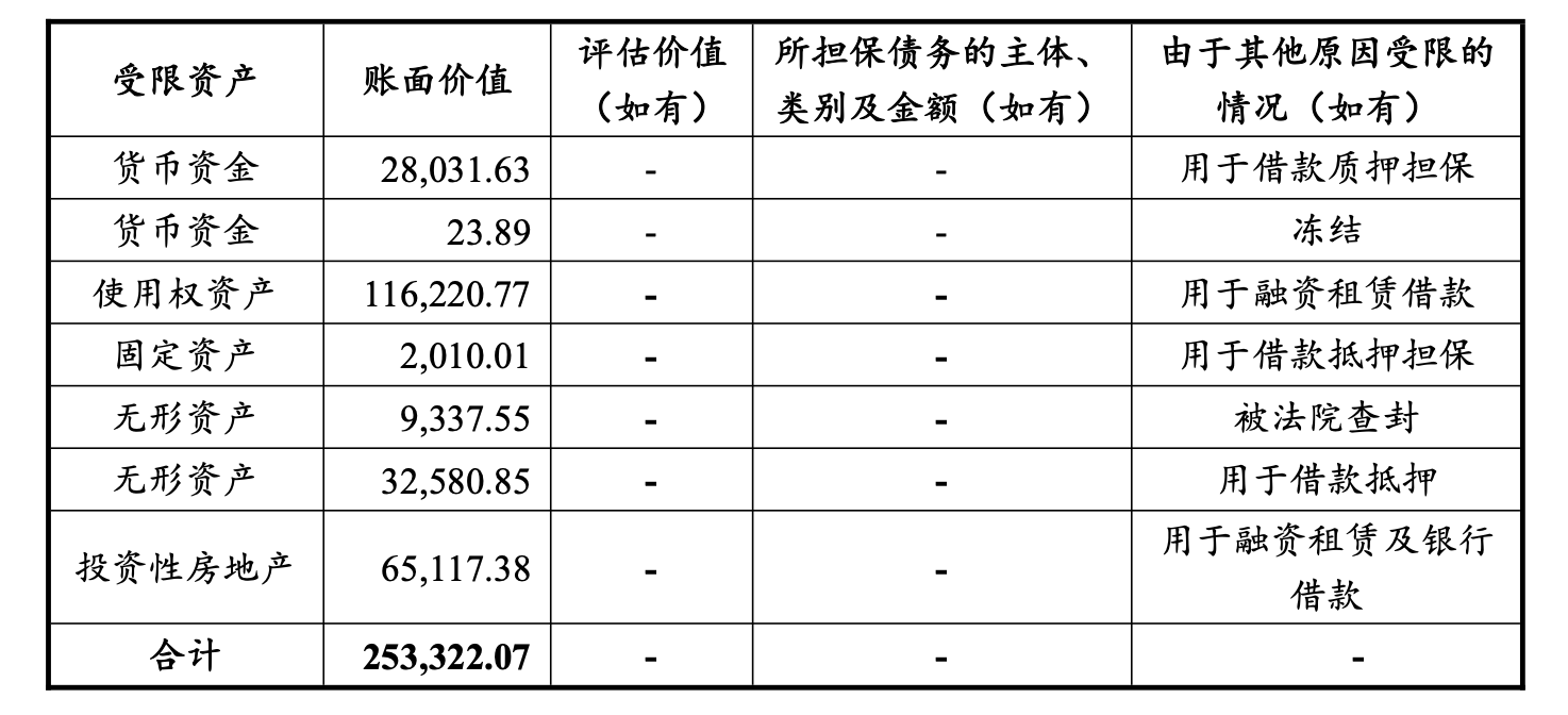受限方面,2024年公司受限资产账面价值为25.33亿元,占同期末经审计净资产的比例为14.51%,受限原因包括借款质押担保、融资租赁借款、借款抵押担保、冻结及被法院查封。