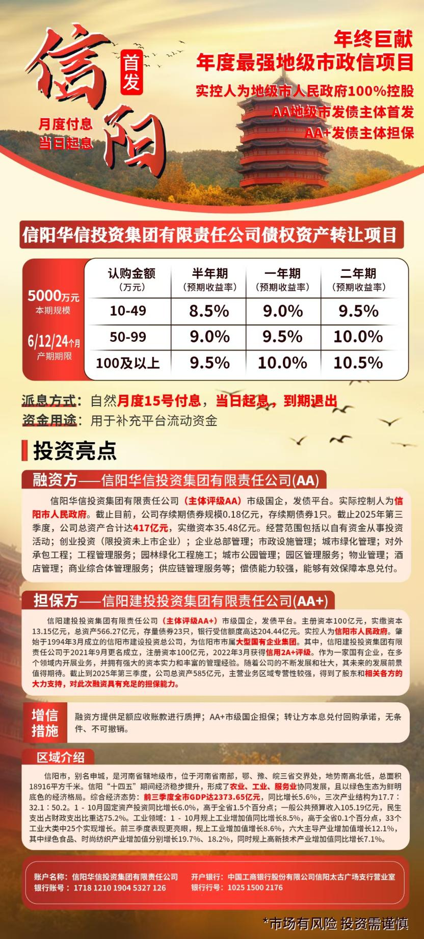 近期,融资市场上出现一款名为“信阳华信投资集团有限公司债权资产转让项目”,该产品发行主体为信阳华信,担保方为其母公司信阳建投。产品总规模5亿元,分十期发行,每期融资5000万元,发行期限为6个月、12个月和24个月,季度付息,十万起投,合同年化收益率为8%起,加上贴息,综合年化收益率高达15.3%。
