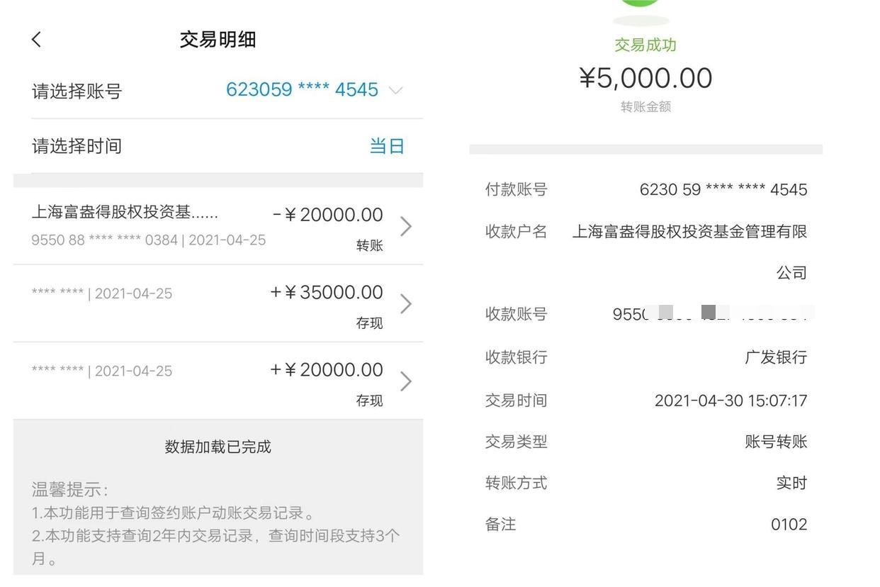 最终打款账号并非项目备案的光大银行,而是该公司名下的广发银行及相关关联账户。同时,私募基金要求,投资起步必须为100万元,而上海富盎得项目投资没有门槛,几万块钱也可以投资。