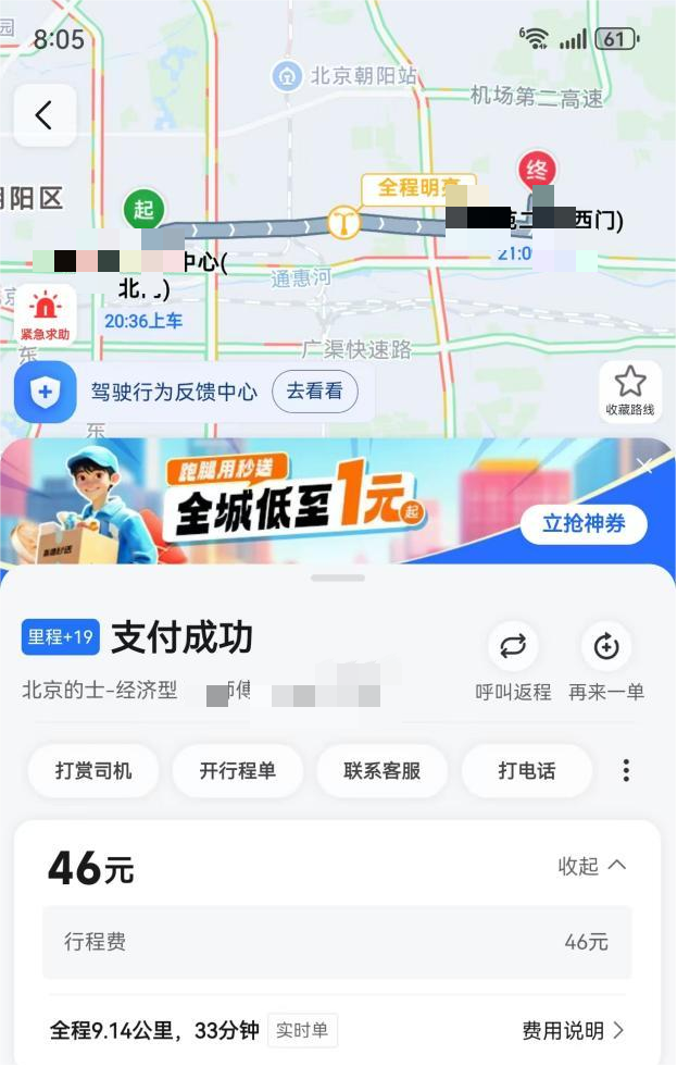 当晚,李先生发现订单实际支付金额为46元,随即拨打司机电话,但多次拒接。