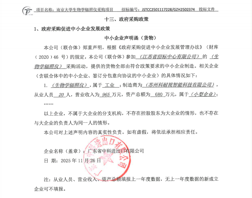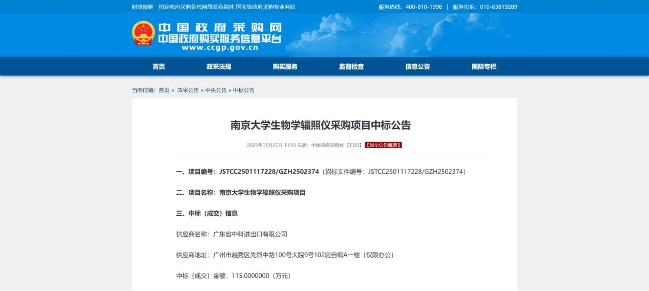 公开信息显示,2025年11月27日,广东省中科进出口有限公司中标南京大学生物学辐照仪采购项目,中标金额115万元,中标品牌为锐源™,制造商就是苏州科耐视。