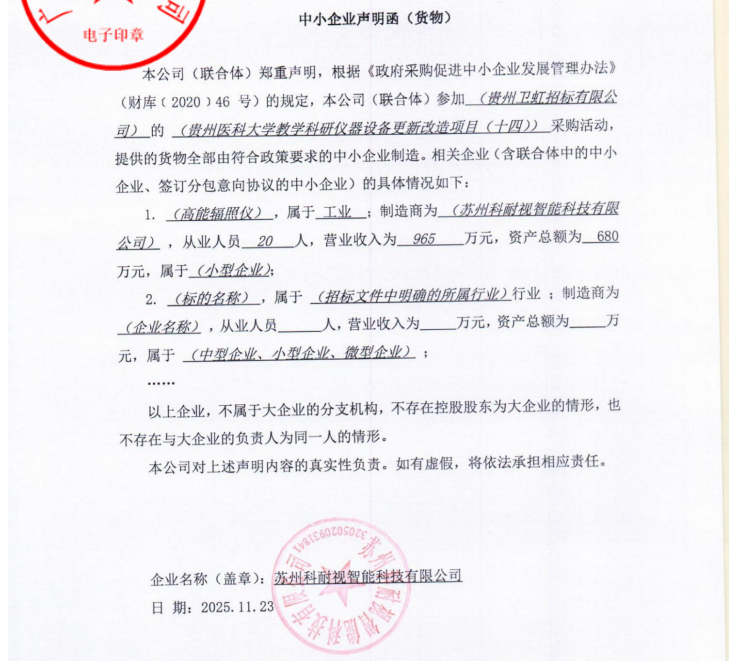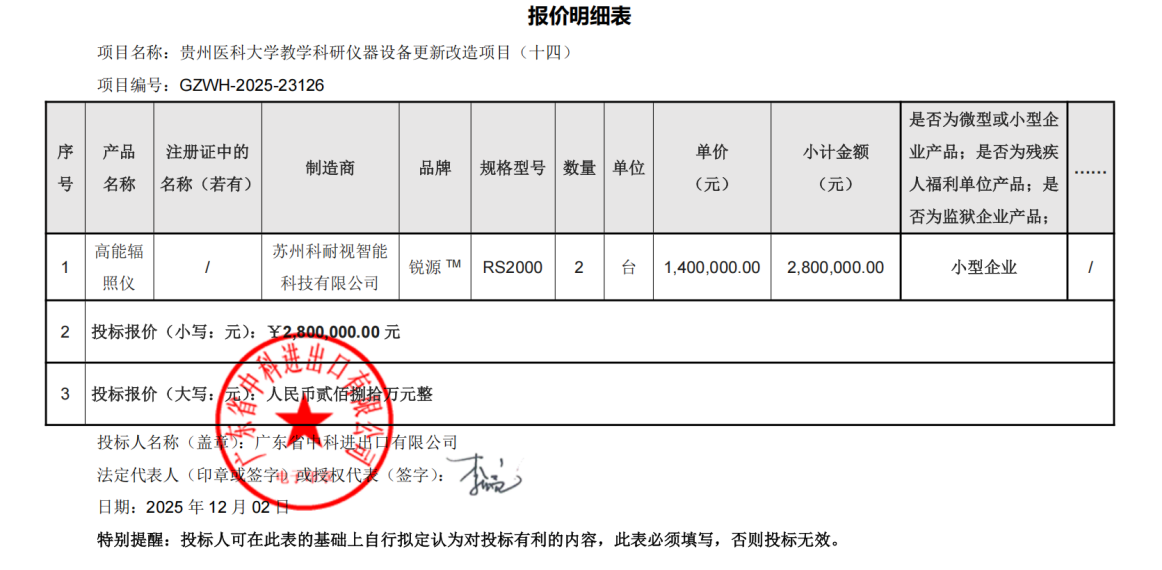 时隔一周,12月5日,贵州医科大学教学科研仪器设备更新改造项目(十四)中,苏州科耐视中标2台同类设备,中标品牌为锐源™,中标金额达280万元。