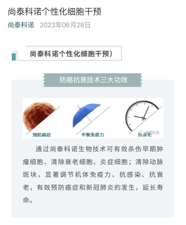 值得注意的是,尚泰科诺曾于2023年在其个性化细胞干预的内容中提及,通过尚泰科诺生物技术可以有效清除衰老细胞、炎症细胞;清除动脉斑块,显著调节集体免疫力、抗感染、抗衰老等。