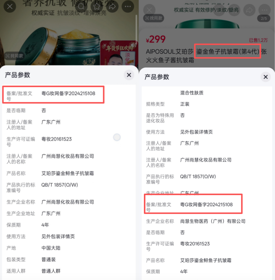 但四代鱼子产品的备案信息却揭开了其“升级”的营销噱头,查询发现,第四代鹿茸备案批准文号为粤G妆网备字2025420820,与上一代的粤G妆网备字2024093282不同;而第四代鱼子霜的备案文号仍为粤G妆网备字 2024215108,与上一代完全一致。
