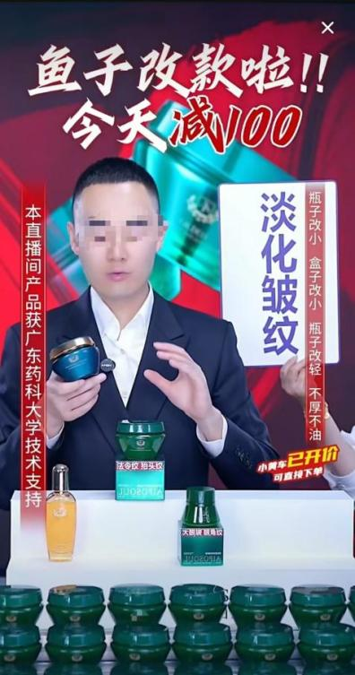 直播间背景用较大字号标注“鱼子改款啦!今天减100”,同时还描述有“本直播间产品均获广东药科大学技术支持”和“瓶子改小、盒子改小、瓶子改轻,肤感不厚不油”的文字。