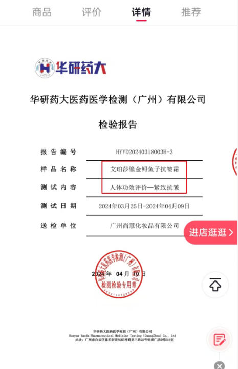 第四代鱼子产品详情页展示了华研药大医药医学检测(广州)有限公司出具的检验报告,测试内容为“人体功效评价—紧致抗皱”,时间为2024年3月25日至4月9日,送检单位广州尚慧化妆品有限公司。