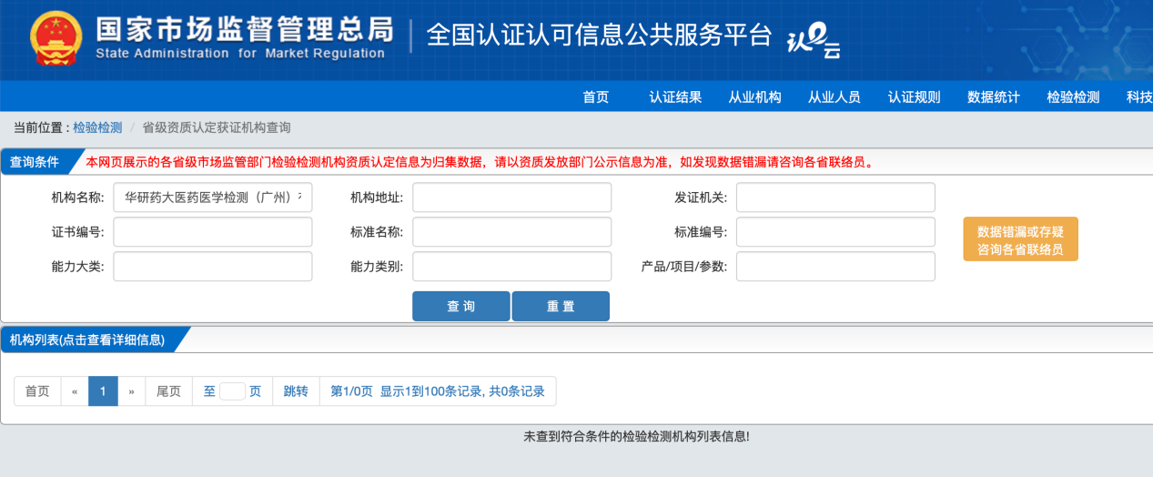 经查询国家市场监督管理总局全国认证认可信息公共服务平台,华研药大检测并未出现在省级资质认定获证机构中,且该机构已于2024年6月更名,现名称为“华研众创(广东)检测科技有限公司”。