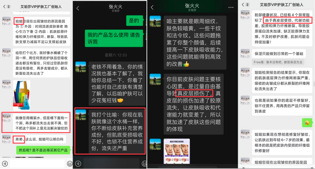 据部分投诉人线上发布的记录,客服似乎有一套相似的话述,如“用木桶漏水比喻肌肤状态”,并揭露其背后原因是“真皮层损伤,导致胶原流失,皮肤吸收和代谢能力变差。”