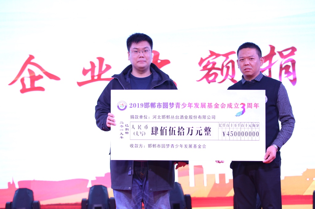 丛台酒业于2018年发起成立了丛台酒业公益基金,该基金是邯郸市圆梦青少年发展基金会下属子基金。基金会的设立是丛台酒业致力公益事业和承担社会责任精神的传承,也是丛台酒业努力推动社会和谐、经济发展决心的彰显。