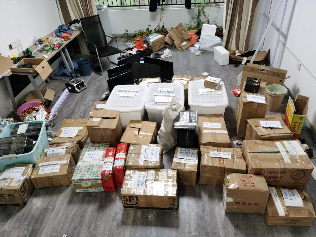 办案民警查获的大量作案工具,有手机、电脑等。(受访单位供图)