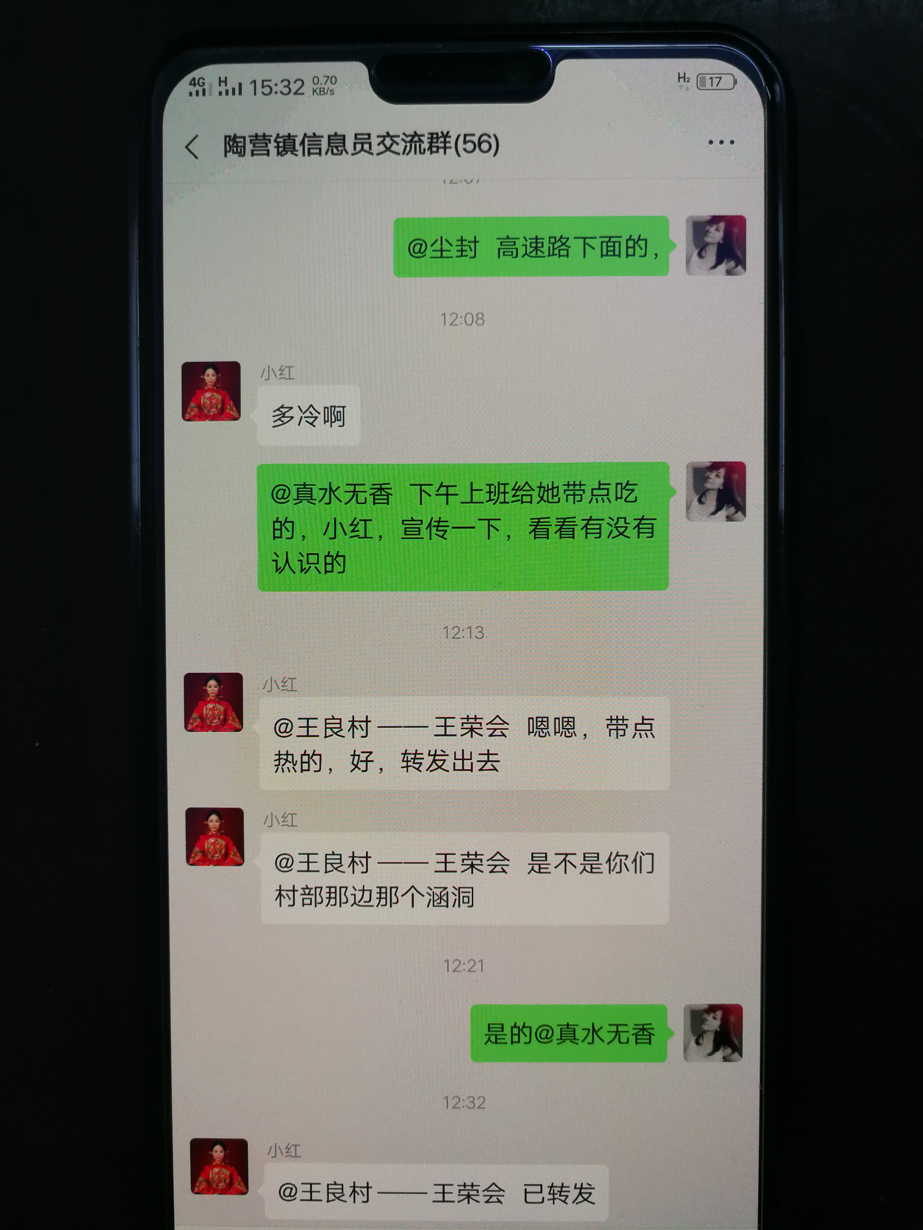 “我当时回家,在村南头一处偏僻的涵洞边看到了张富春老人,为怕老人出事我问她相关信息,因她是聋哑人说不清自己是哪里人。她问老人吃饭了没有?她摇摇头。”王良村的信息员王荣会11:41分在陶营镇信息员交流群里发布了寻人的一个内容。随后,她为老人带来了饼干等食品。