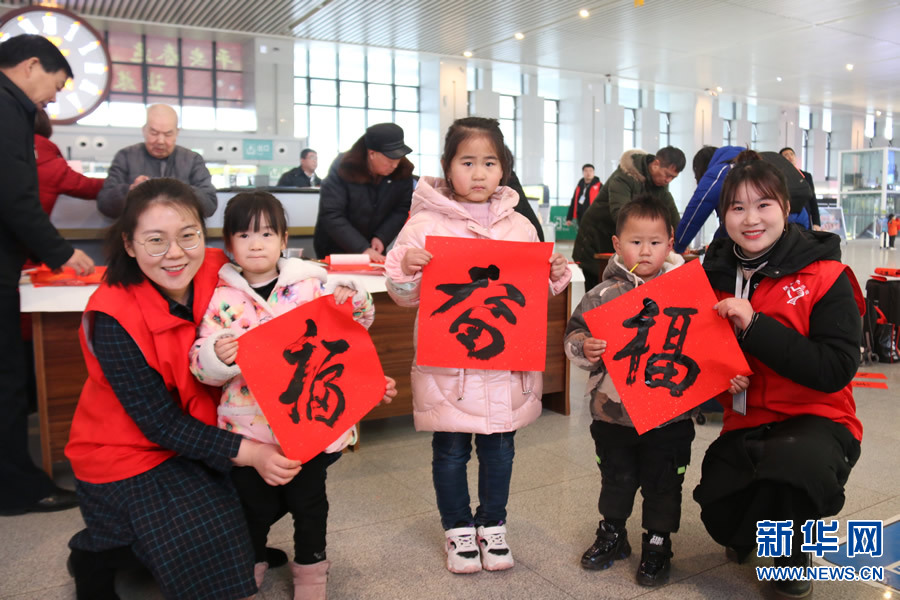 当日,候车大厅节日氛围浓厚,服务台前围满了旅客,该站退休书法爱好者为旅客挥毫泼墨,写对联、送福字,送去新春的祝福。青年志愿者们还为旅客送上了寓意甜甜美美的麻糖。