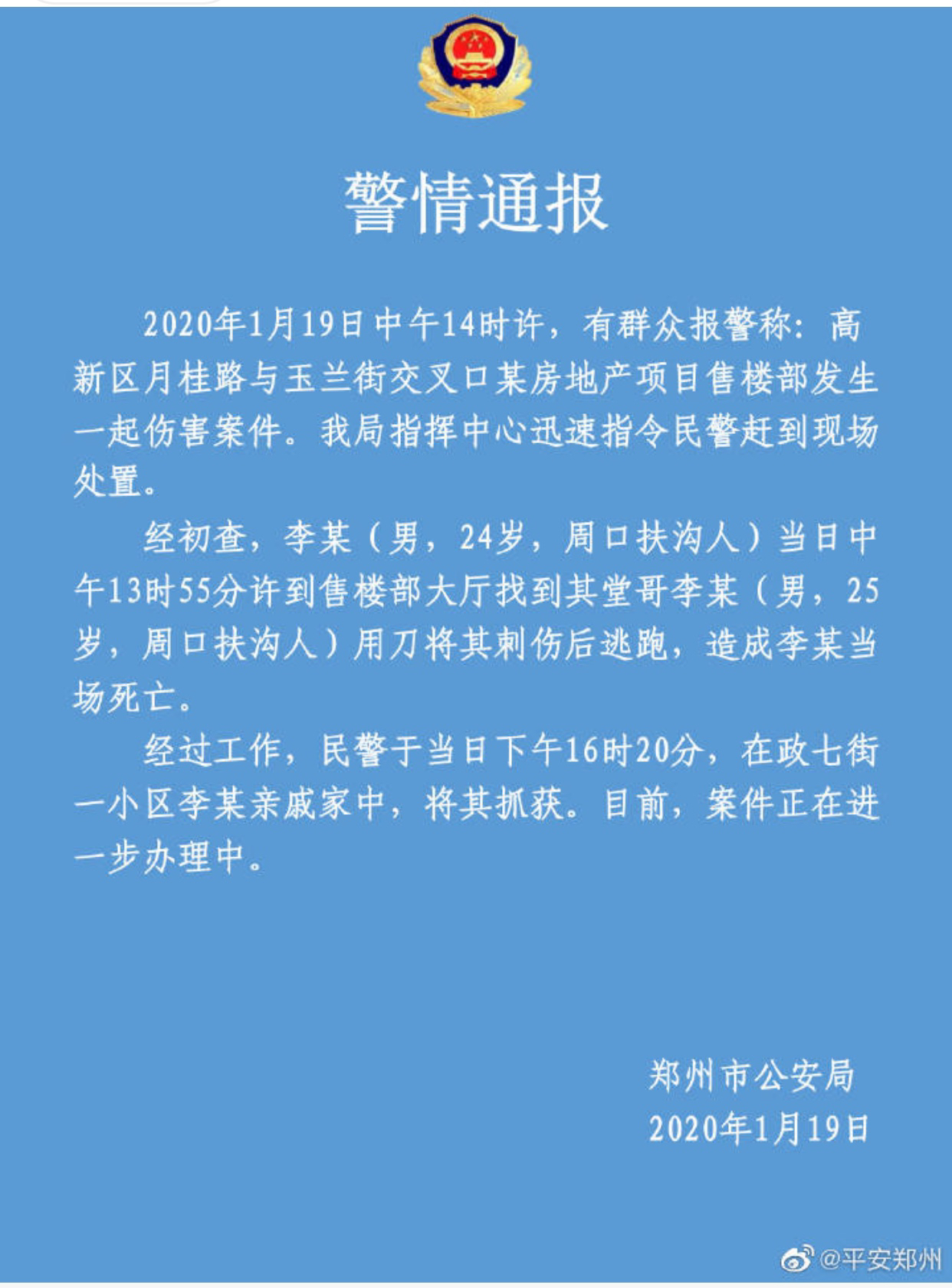 经初查,李某(男,24岁,周口扶沟人)当日中午 13时55分许到售楼部大厅找到其堂哥李某(男,25岁,周口扶沟人)用刀将其刺伤后逃跑,造成李某当场死亡。
