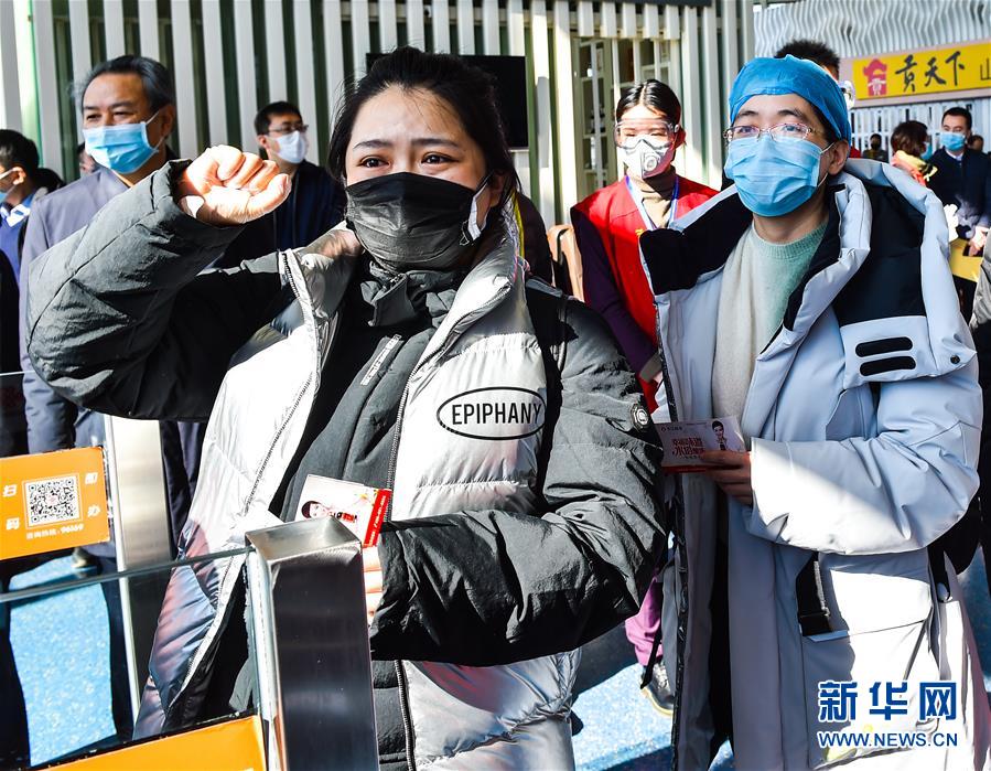 2月16日,山西省第九批支援湖北医疗队队员在太原武宿机场向送行的同事挥手告别。 新华社发(柴婷 摄)