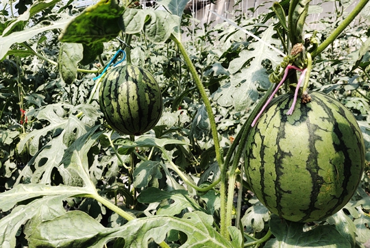 你见过吊在空中生长的西瓜吗?这种西瓜个头不大,却圆溜溜的煞是可爱。“我们起名叫‘礼品西瓜’,它具有皮薄、瓤脆、汁多、糖分高、口感好的特点。来来来,先吃瓜,再评价!”洪爱玲直爽地说。