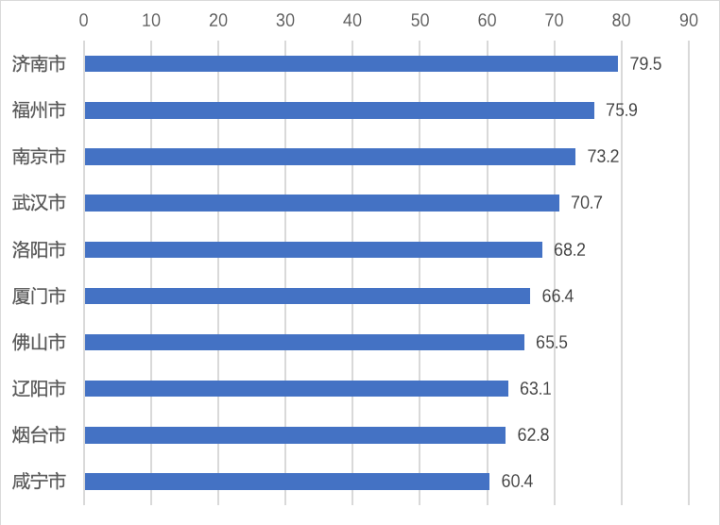 其中,综合传播力指数是指地市级文旅新媒体综合传播力评价维度由微信传播力、微博传播力、头条号传播力和抖音传播力四个一级指标构成。权重构成为:微信传播力35%;微博传播力30%;头条号传播力15%;抖音传播力20%。基于对地市级文旅机构微信、微博、头条号和抖音传播力综合评价的结果,2020年4月全国地市级文旅新媒体传播力指数TOP10排序为: 济南市、福州市、南京市、武汉市、洛阳市、厦门市、佛山市、辽阳市、烟台市、咸宁市。