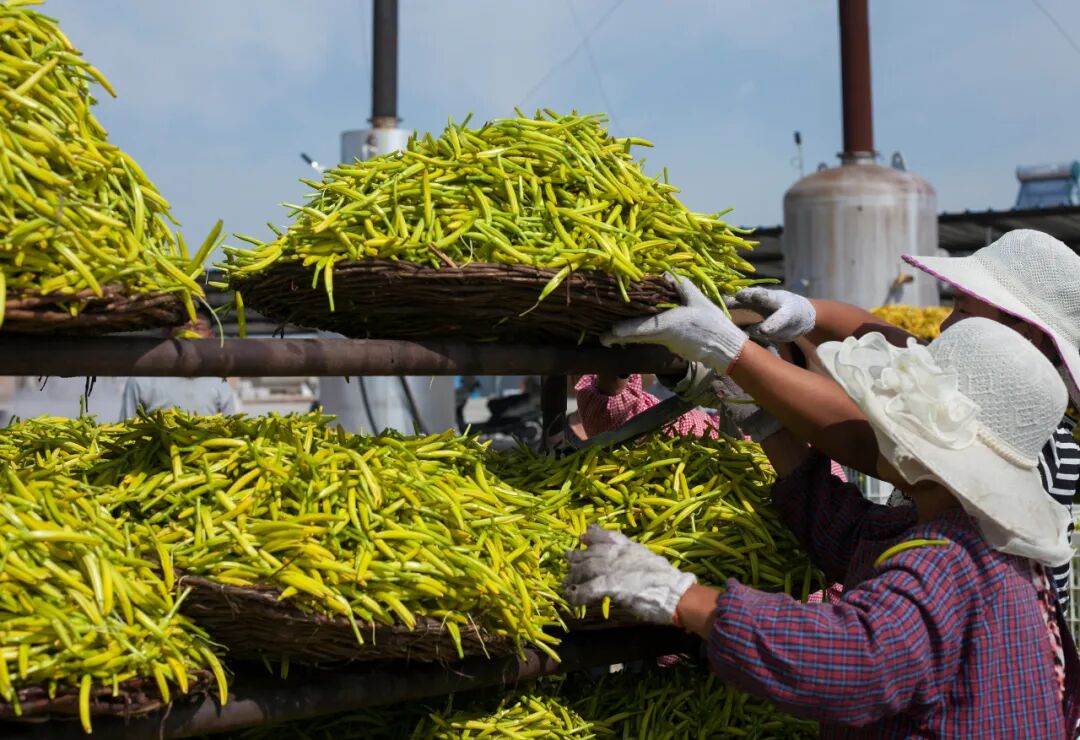 农户把黄花装筐,随后将进行蒸、晒等流程。新华社 发