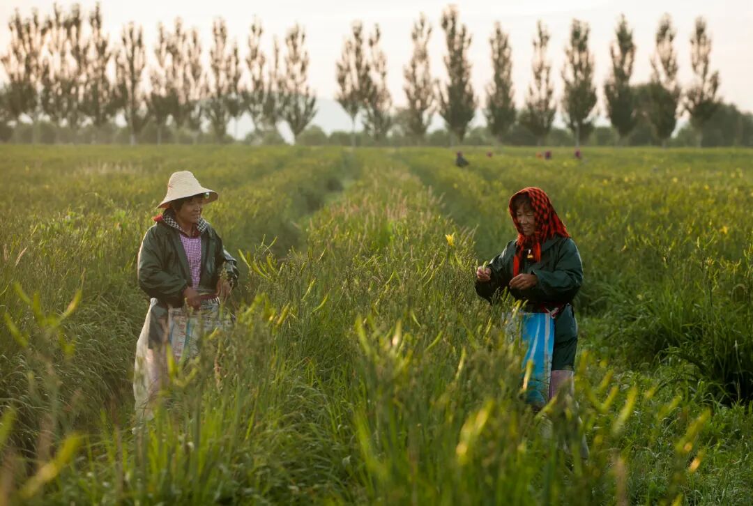 清晨,西坪镇唐家堡村的农户在采摘黄花。新华社 发