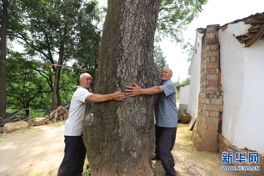 2020年5月27日,在河南省卢氏县文峪乡杨家场村赵家岭,一位老人正在向人们介绍新近发现的古椿树。这棵古椿树高约20米,需要2个人才能勉强合抱过来。