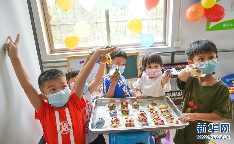 2020年5月28日,河南省洛阳市涧西区重庆路街道第一社区“儿童之家”,几名小朋友在手工制作卡通馒头。