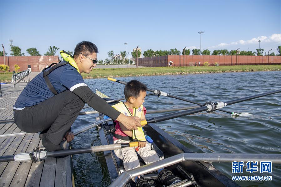 5月28日,在太原市水上运动中心,任霄泽(左)指导一名小朋友练习划桨。